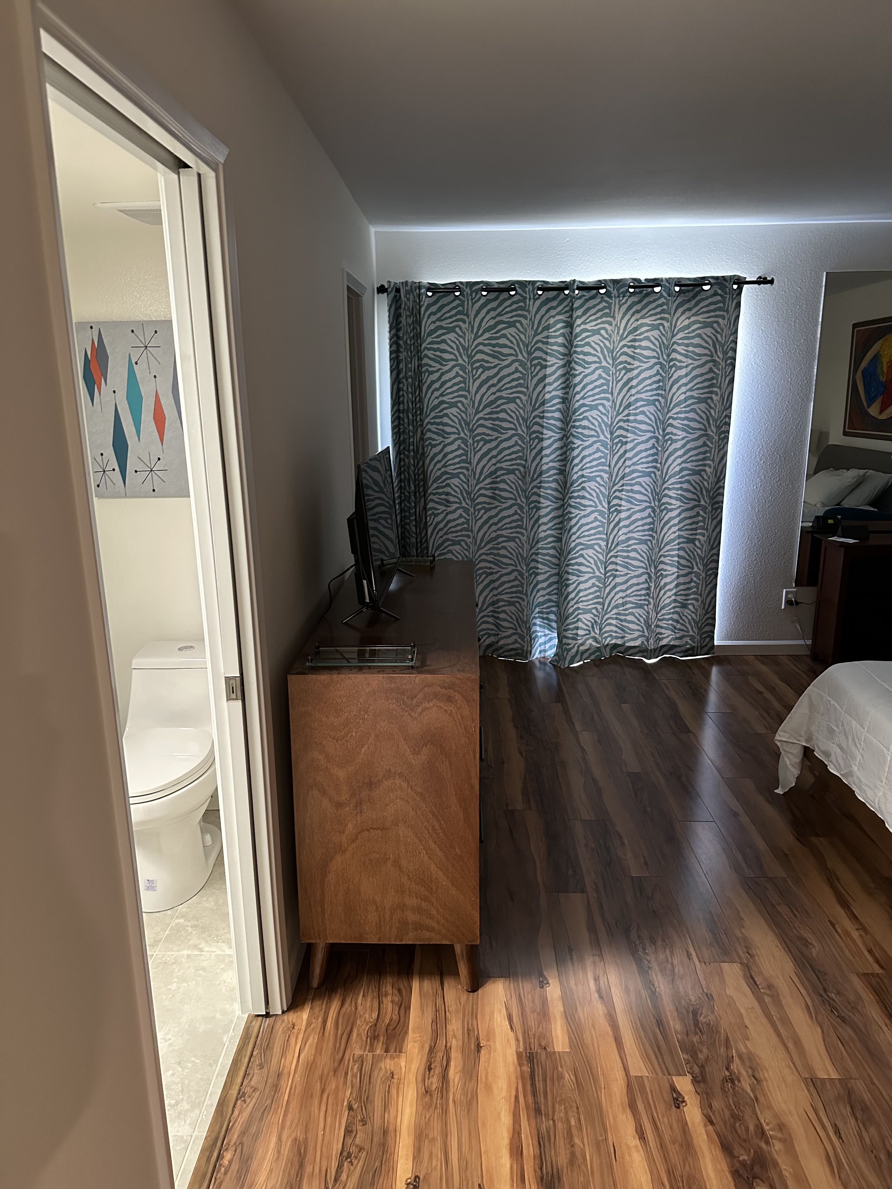 The generously oversized bedroom offers a tranquil retreat, with enough space to accommodate a larger bed, seating, or a small workspace while still feeling open and uncluttered. An equally oversized closet provides abundant storage, helping keep the home organized and tailored to long-term living needs. The bathroom continues the contemporary aesthetic, featuring clean lines, minimalist design, and modern fixtures that contribute to a polished, spa-like experience.