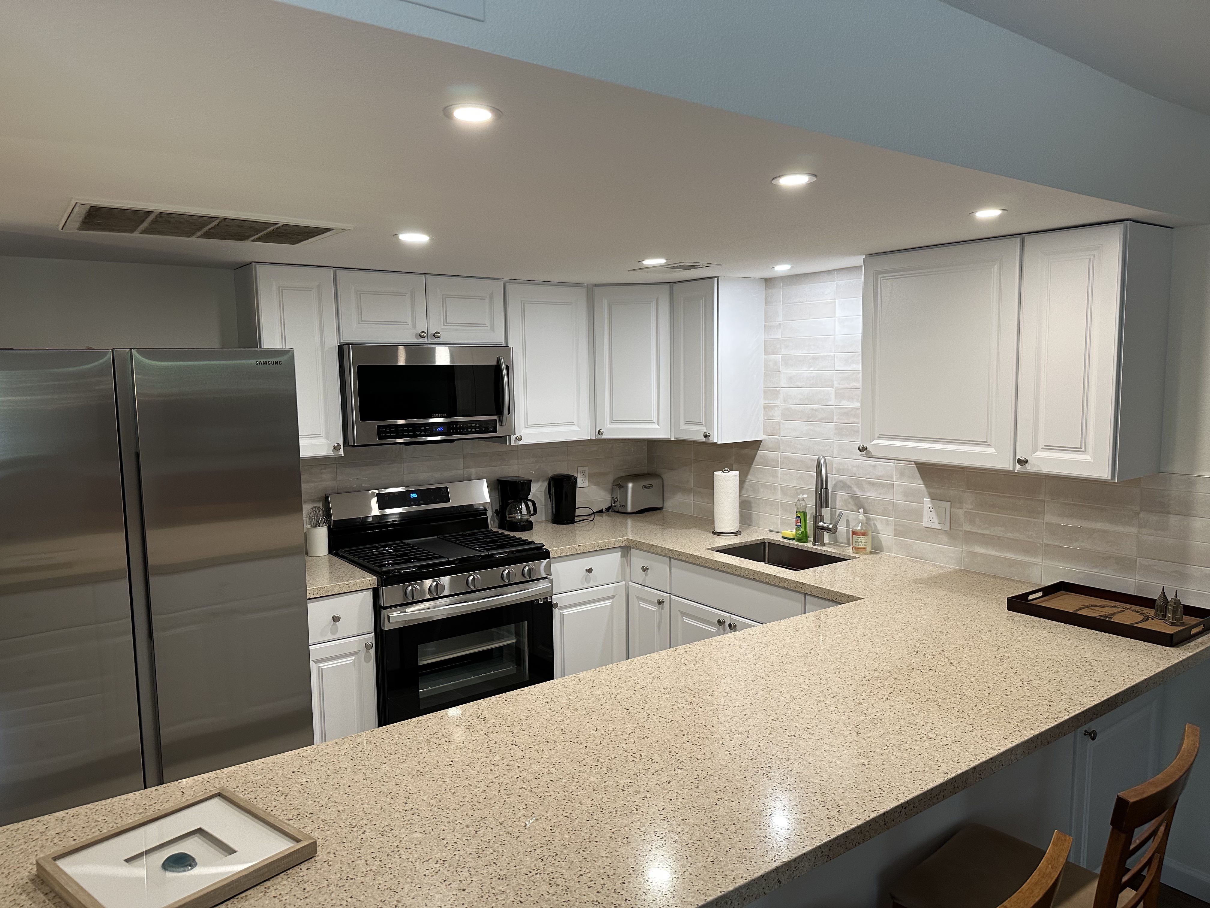 The living area provides a comfortable and inviting space to unwind, entertain, or work from home, with proportions that make furniture placement and layout easy and functional. Adjacent to the living room, the modern kitchen is equipped with updated appliances, ample cabinet storage, and elegant countertops, creating a highly functional environment for daily cooking as well as hosting friends and family. The seamless connection between living and kitchen areas enhances the open, flowing feel of the apartment, making it well-suited to long-term stays.