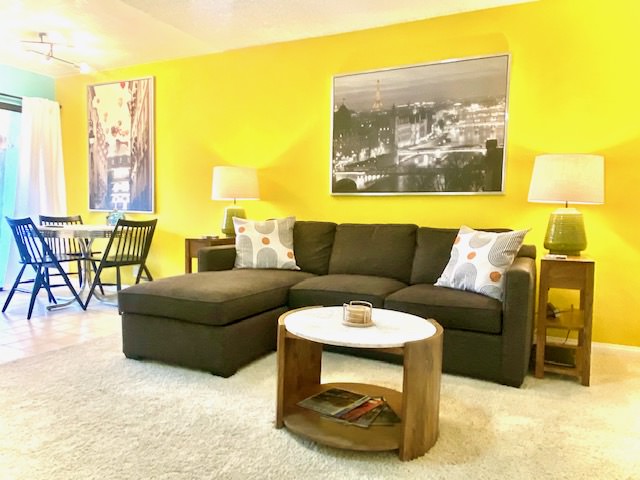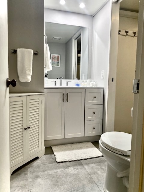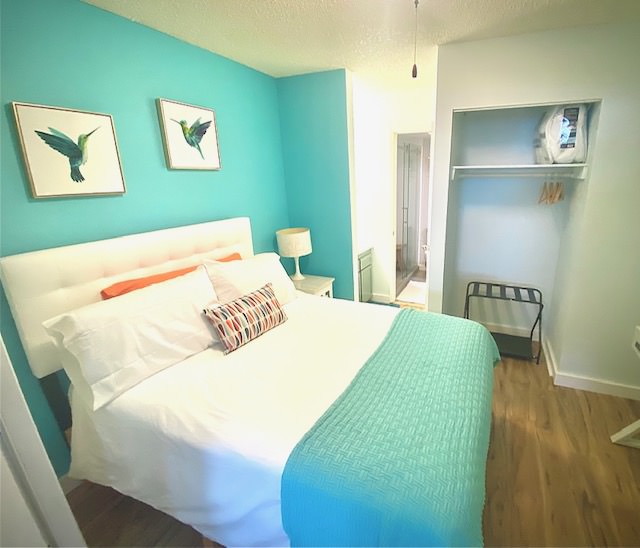 The primary bedroom features a king-size bed for restorative sleep, while the second bedroom offers a double bed for additional guests or flexible use of space. Inside, you will find a newly renovated bathroom, a clean, cozy living area, a full kitchen, and an in-unit washer/dryer, providing the essential comforts and functionality of a modern home for longer stays.